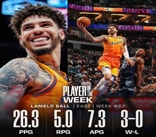 北京时间3月24日,NBA官方公布了第22周的周最佳球员,湖人球星卢卡-东契奇当选西部周最佳,黄蜂球星拉梅洛-鲍尔(三球)当选东部周最佳。哈登、阿门、文班亚马等球星获得提名。