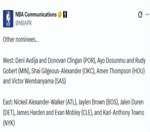 西部:阿夫迪亚和克林根(开拓者)、多森姆和戈贝尔(森林狼)、亚历山大(雷霆)、阿门-汤普森(火箭)、文班亚马(马刺)